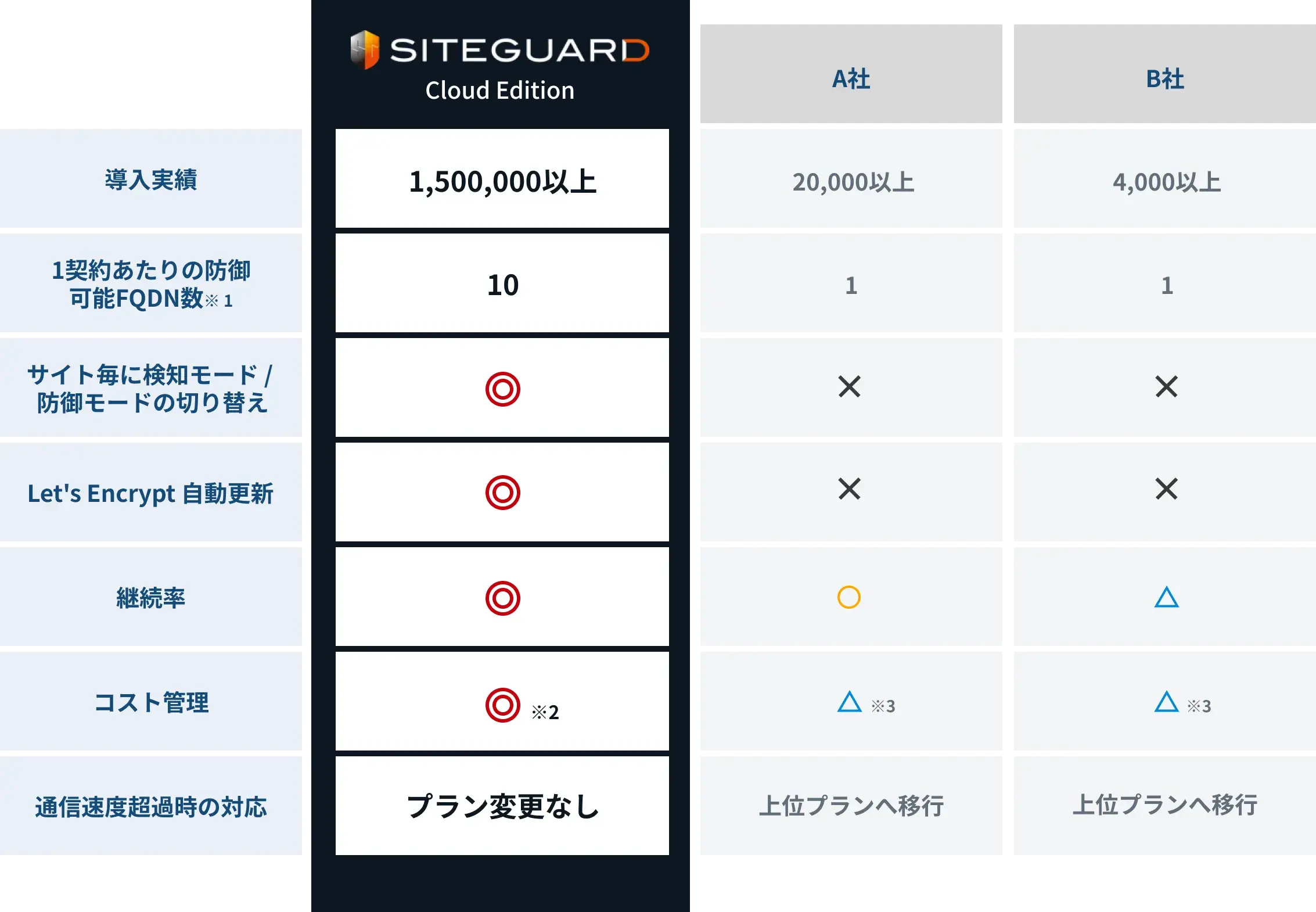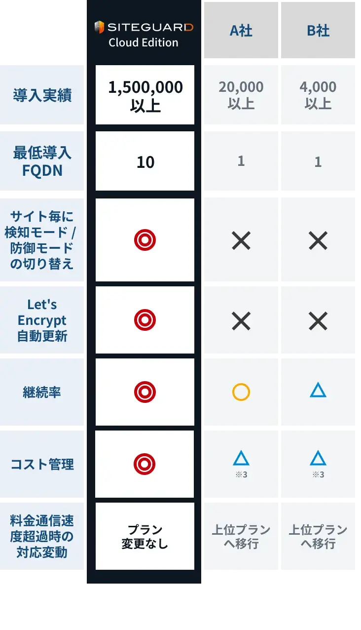 シンプルなシグネチャ方式のWAFとして、SiteGuardシリーズ18年の実績があります。クラウド型WAFを2022年10月より提供開始。国内開発・販売・サポートでお客様のご要望に応え続け、様々な機能を追加してまいりました。 おかげさまで「国内WAF市場シェアNo.1※」を獲得、国産メーカーならではのサポート品質でお客様のWebサイトのセキュリティ対策に貢献いたします。