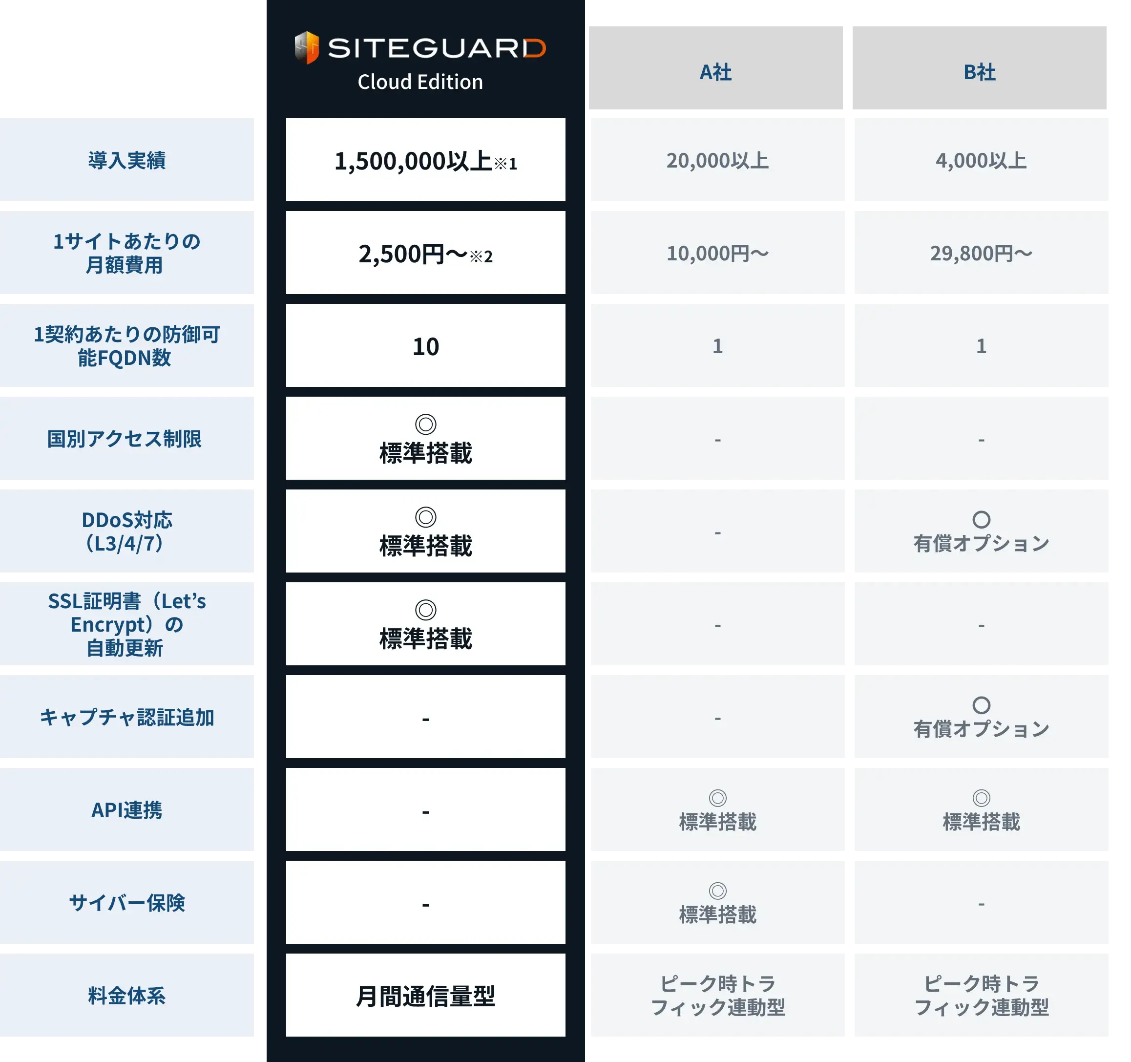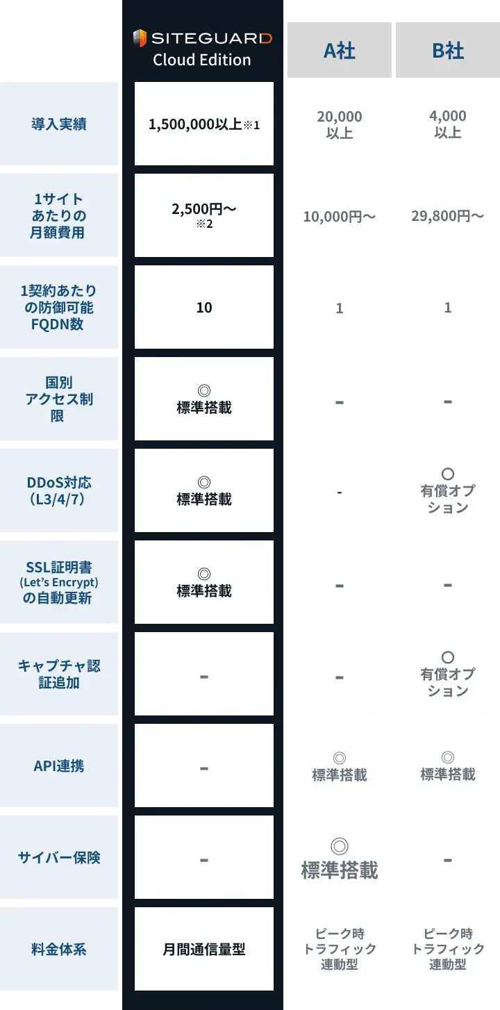 シンプルなシグネチャ方式のWAFとして、SiteGuardシリーズ18年の実績があります。クラウド型WAFを2022年10月より提供開始。国内開発・販売・サポートでお客様のご要望に応え続け、様々な機能を追加してまいりました。 おかげさまで「国内WAF市場シェアNo.1※」を獲得、国産メーカーならではのサポート品質でお客様のWebサイトのセキュリティ対策に貢献いたします。